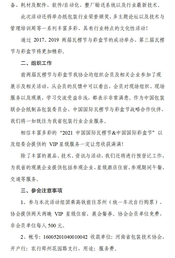 河南省包装技术协会关于组织赴赴苏州国际博览中心参加2021第三届中国国际瓦楞节&中国国际彩盒节的通知