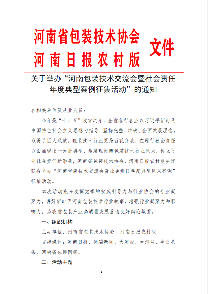 关于举办“河南包装技术交流会暨社会责任 年度典型案例征集活动”的通知