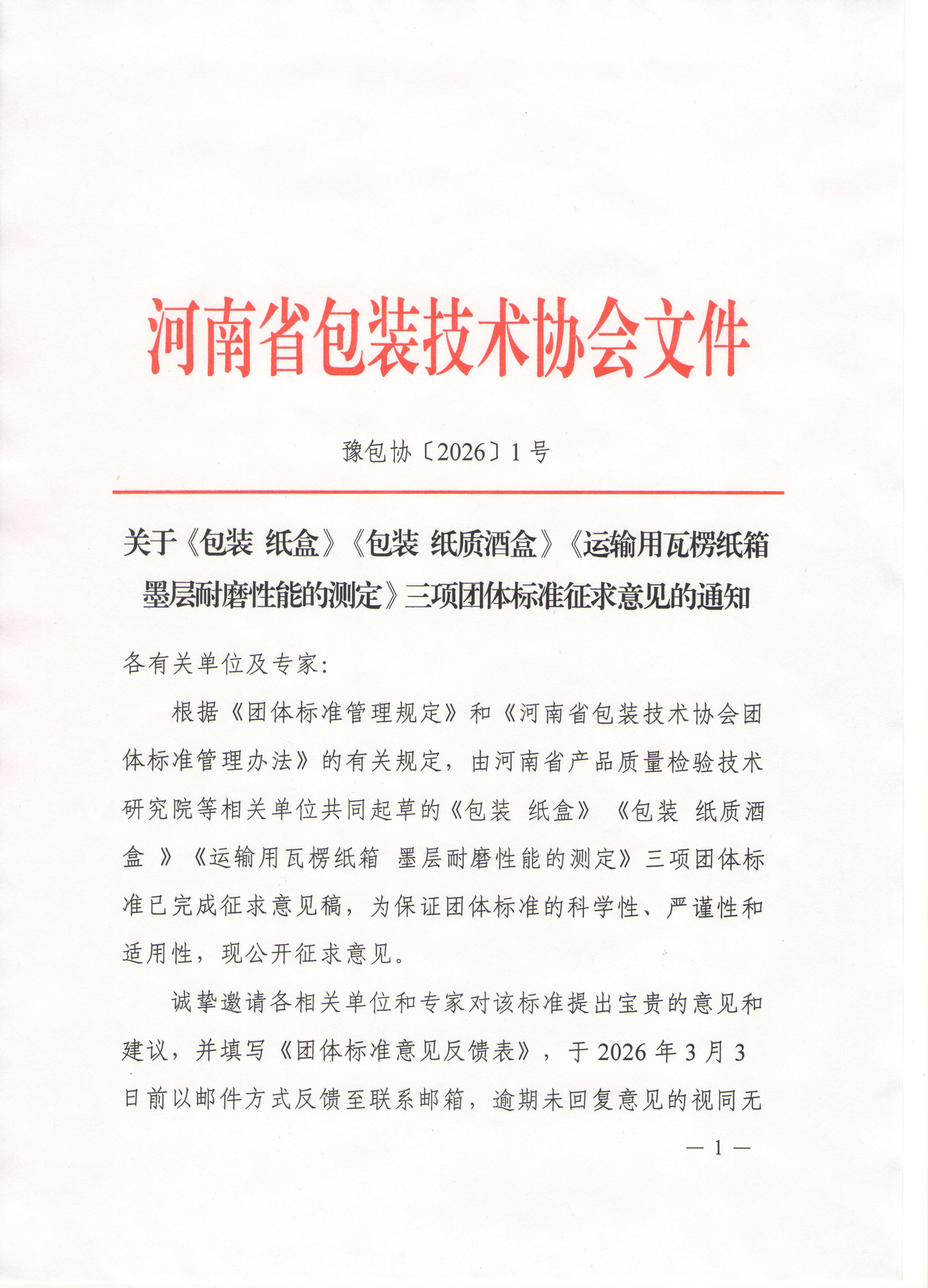 关于《包装 纸盒》《包装 纸质酒盒》《运输用瓦楞纸箱 墨层耐磨性能的测定》三项团体标准征求意见的通知