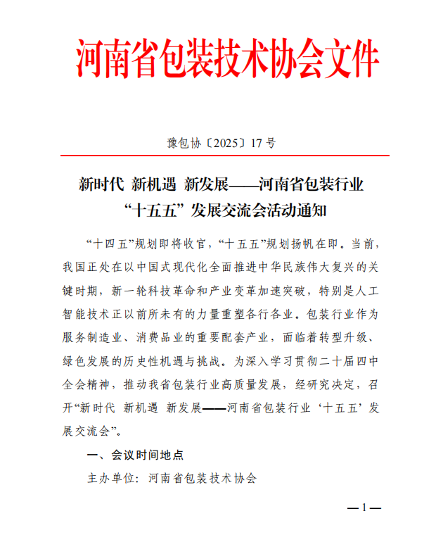 豫包协〔2025〕17号 新时代 新机遇 新发展——河南省包装行业 “十五五”发展交流会活动通知