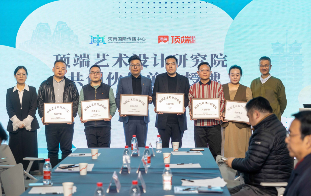 /河南日报社外宣部(河南国际传播中心)主任王曦辉、顶端新闻执行总编辑朱琨分别为顶端艺术·设计研究院共创伙伴单位授牌/