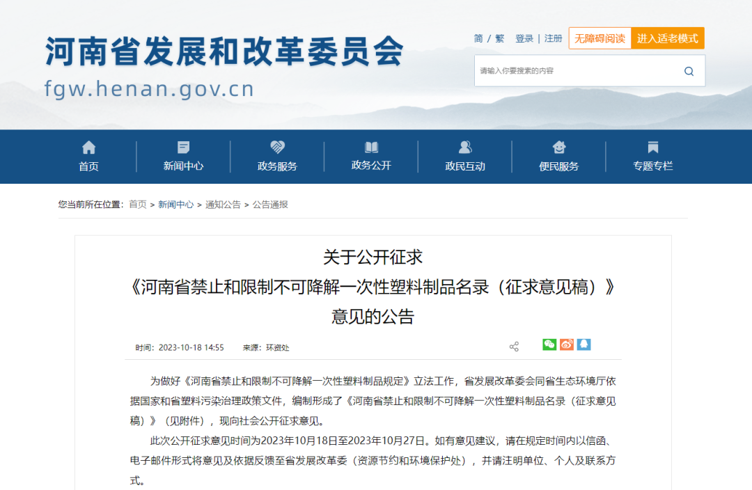 河南省发改委就《河南省禁止和限制不可降解一次性塑料制品名录》征求意见